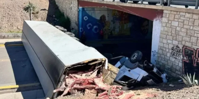 Un camión que transportaba carne se desplomó antes de cruzar un puente en el Acceso Este y quedó dado vuelta sobre una importante calle de Guaymallén.